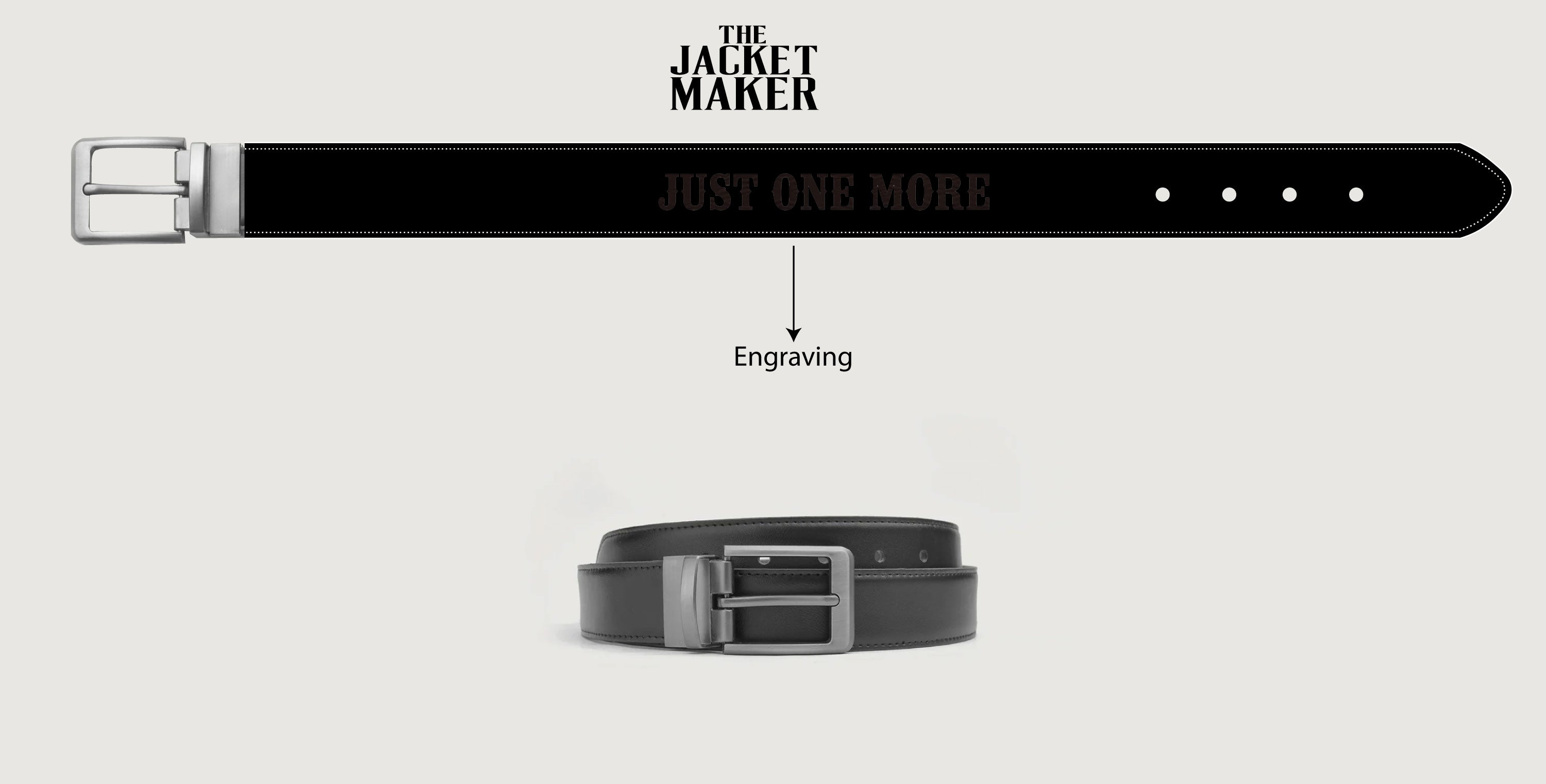 • Engraving of "JUST ONE MORE" in the center at the back of the strap of the belt (engraving on the black part, not the brown part of the belt) (as per mock)