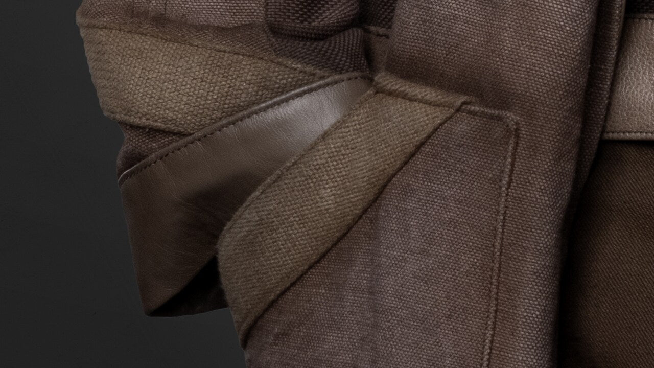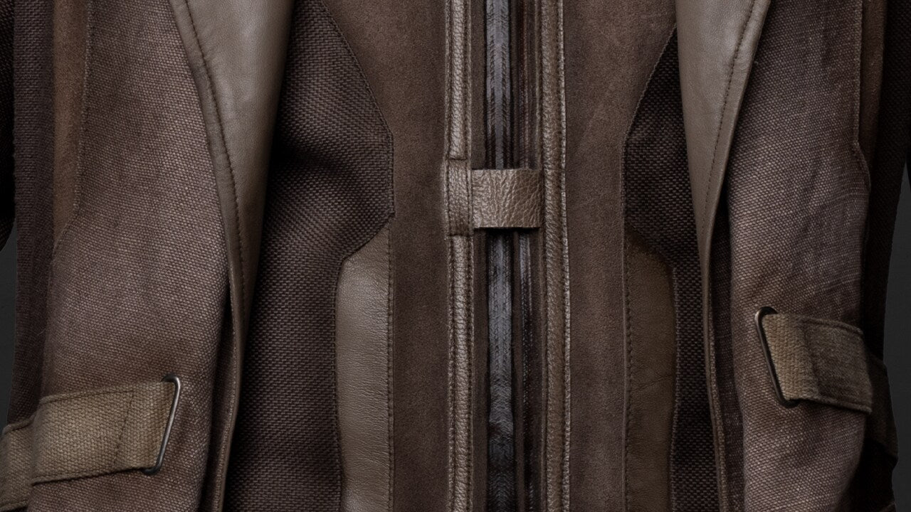• Outer Shell: Premium cotton canvas with contrasting leather trim accents for a screen-accurate look and enhanced durability
